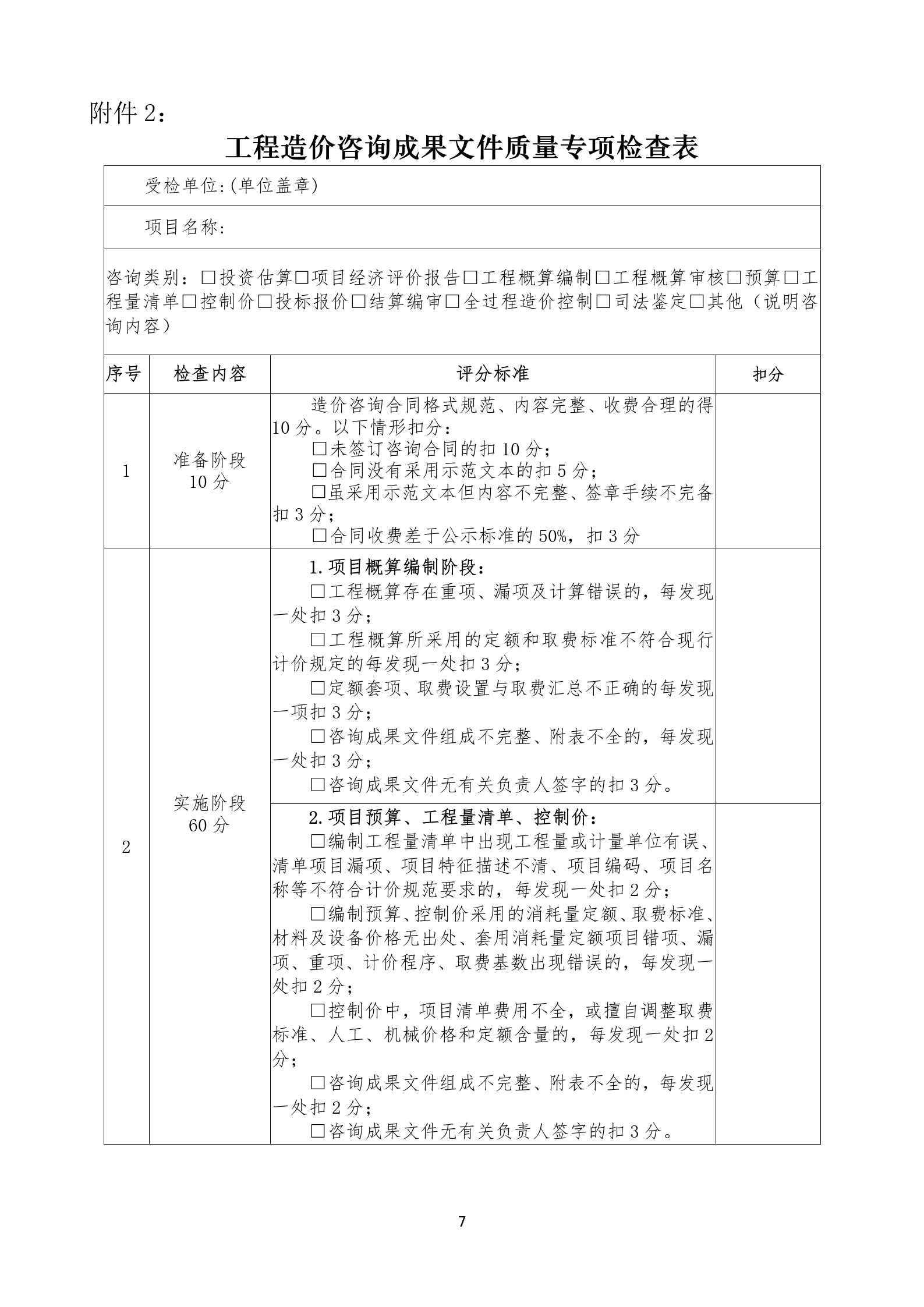 根據(jù)《工程造價(jià)咨詢成果文件質(zhì)量專項(xiàng)檢查表》(附件2)判定。檢查結(jié)果分為優(yōu)秀、合格、不合格。
