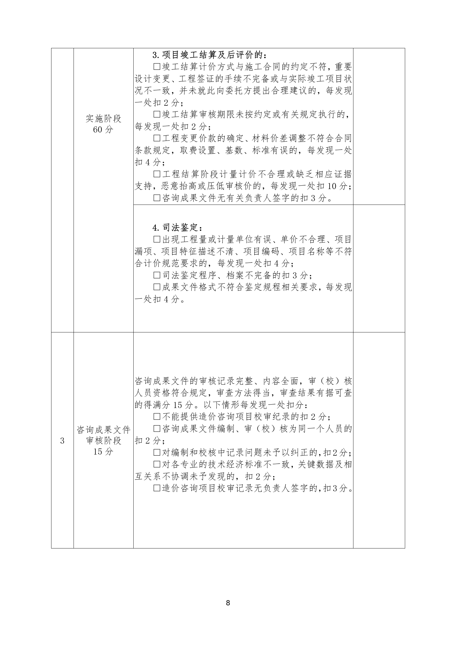 (三)不合格:工程造價(jià)咨詢企業(yè)發(fā)生過相關(guān)禁止的違法、違規(guī)行為;存在逾期未整改、整改后仍不合格,或咨詢成果文件專項(xiàng)檢查分值在60分以下的。