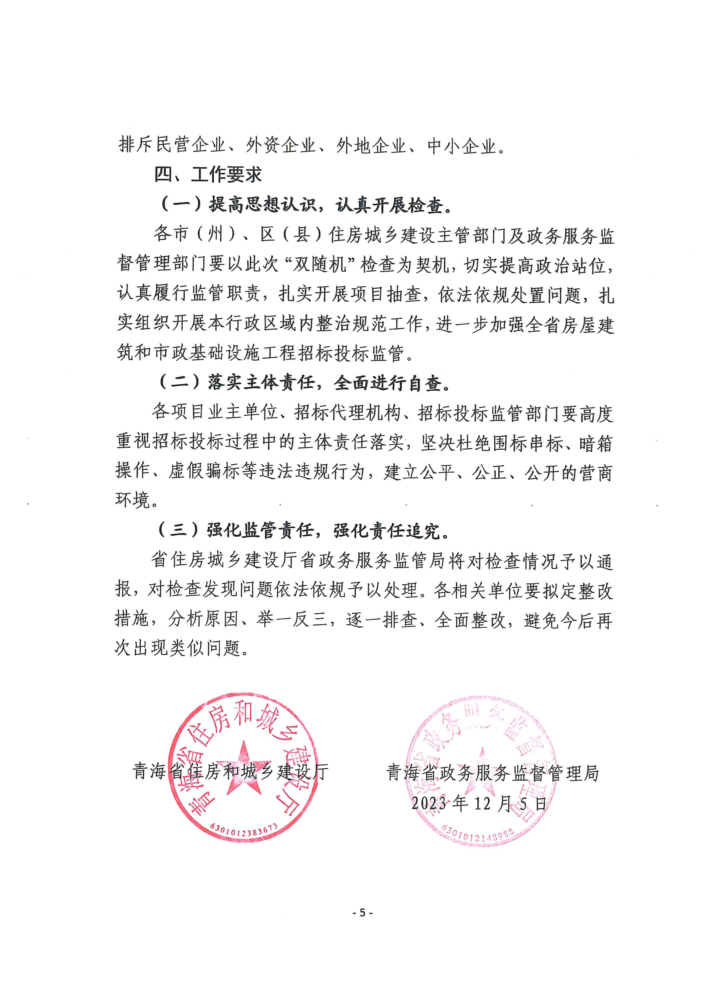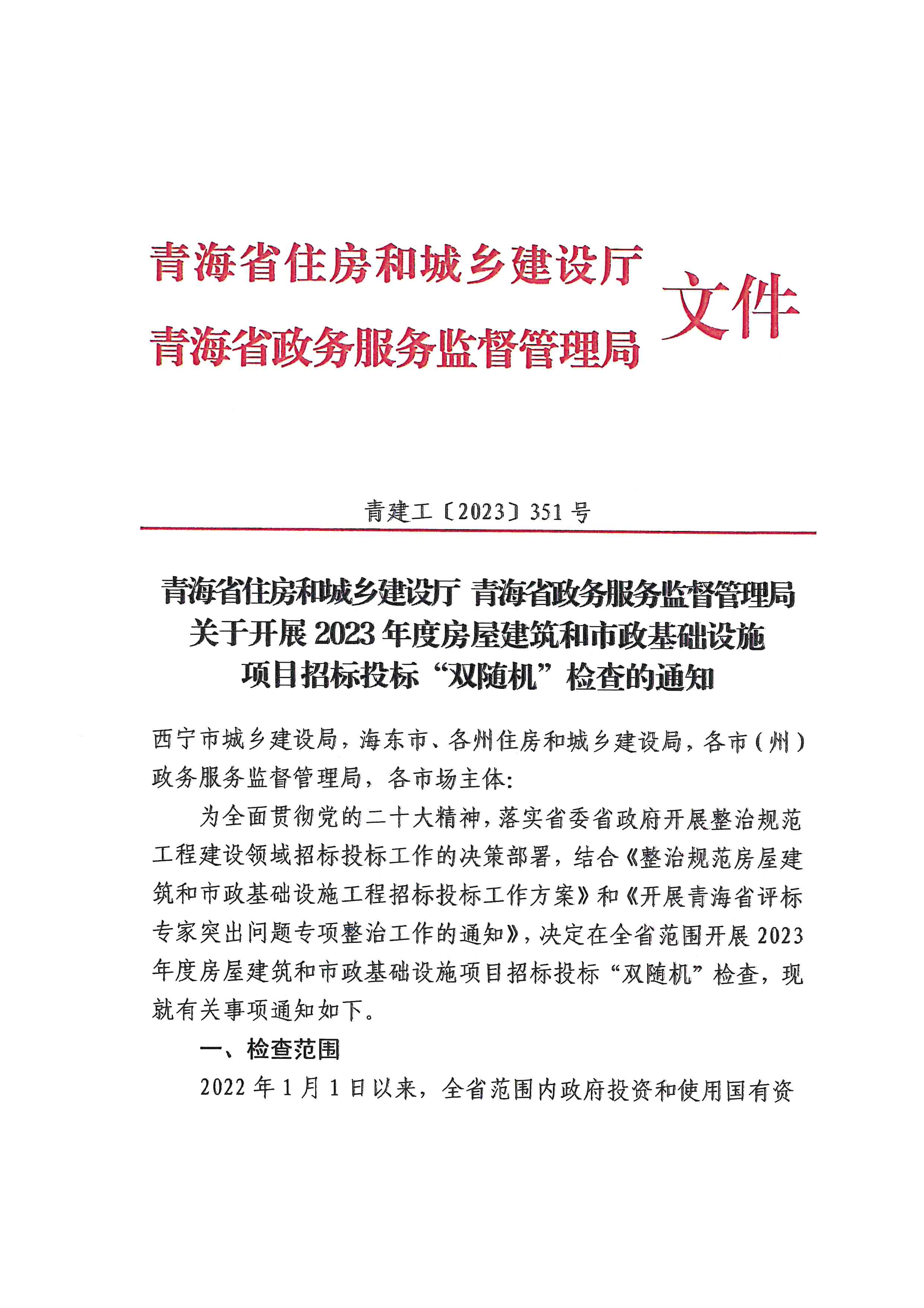 青海省住房和城鄉(xiāng)建設(shè)廳 青海省政務(wù)服務(wù)監(jiān)督管理局 關(guān)于開展2023年度房屋建筑和市政基礎(chǔ)設(shè)施項(xiàng)目招標(biāo)投標(biāo)“雙隨機(jī)”檢查的通知