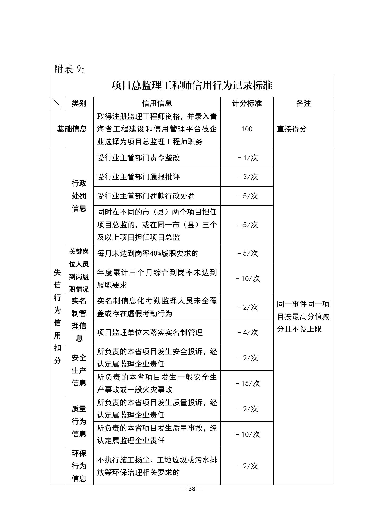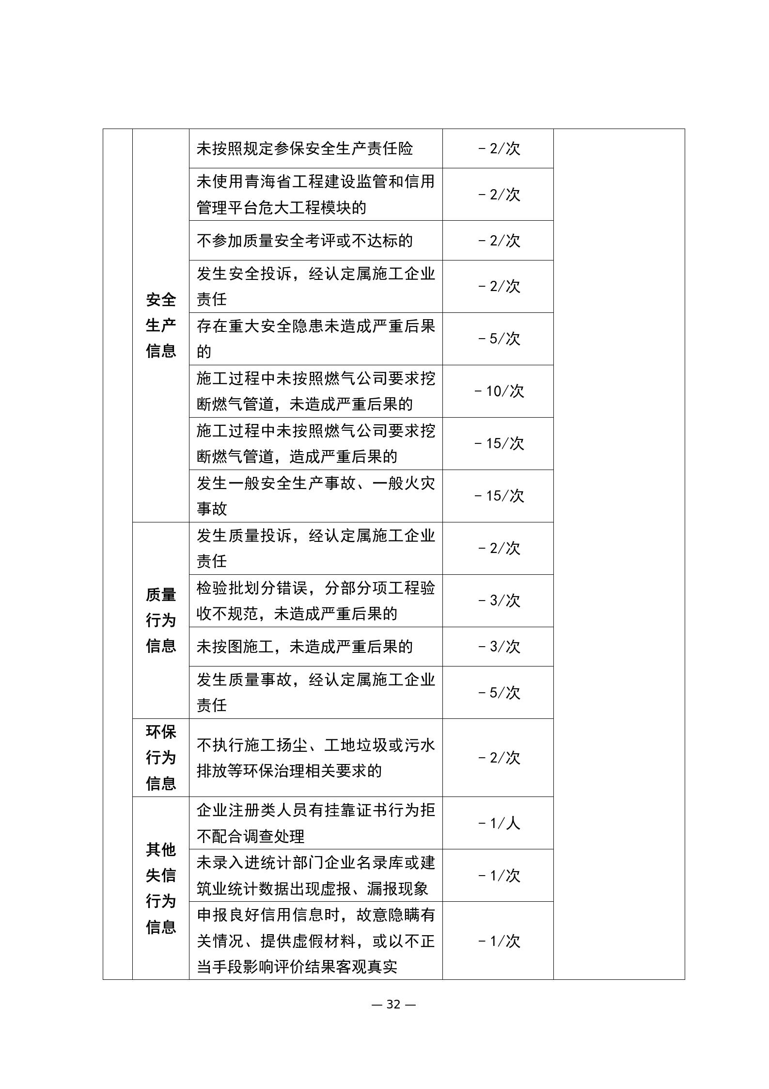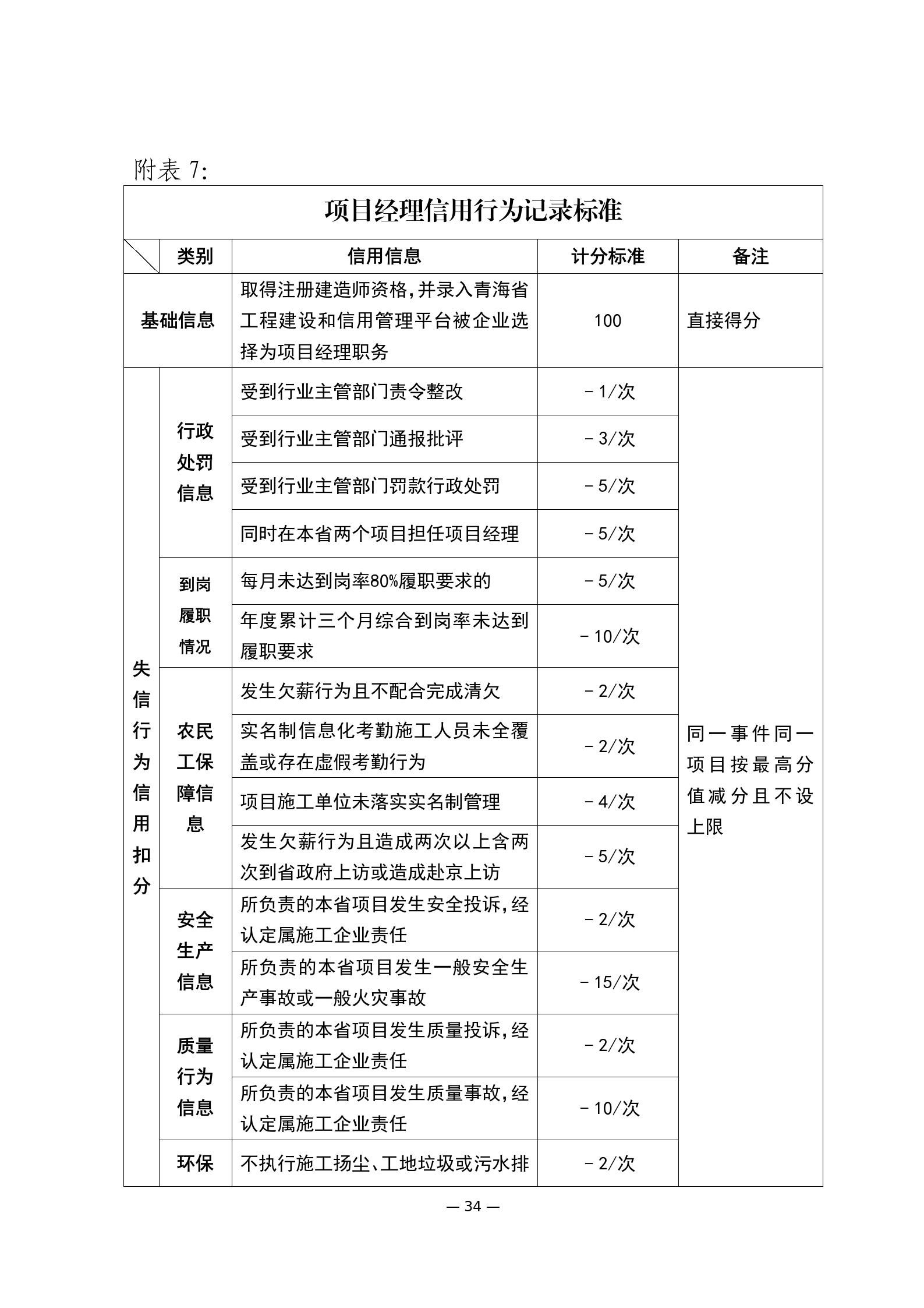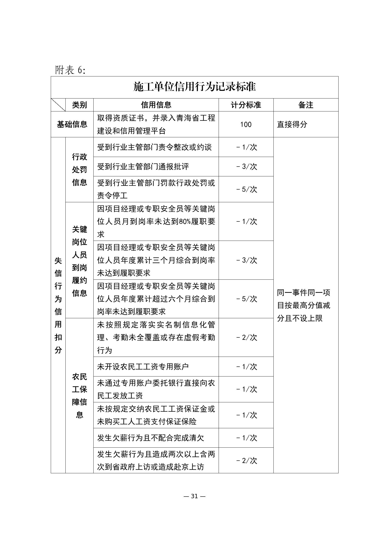 第十六條 建筑市場各方主體和從業(yè)人員的信用評價實行信用記錄、守信獎勵和失信行為動態(tài)記錄記分制。根據(jù)《青海省建筑市場各方主體和從業(yè)人員失信行為記分標(biāo)準(zhǔn)》(附件)進(jìn)行公開展示和記分?;A(chǔ)分100分。