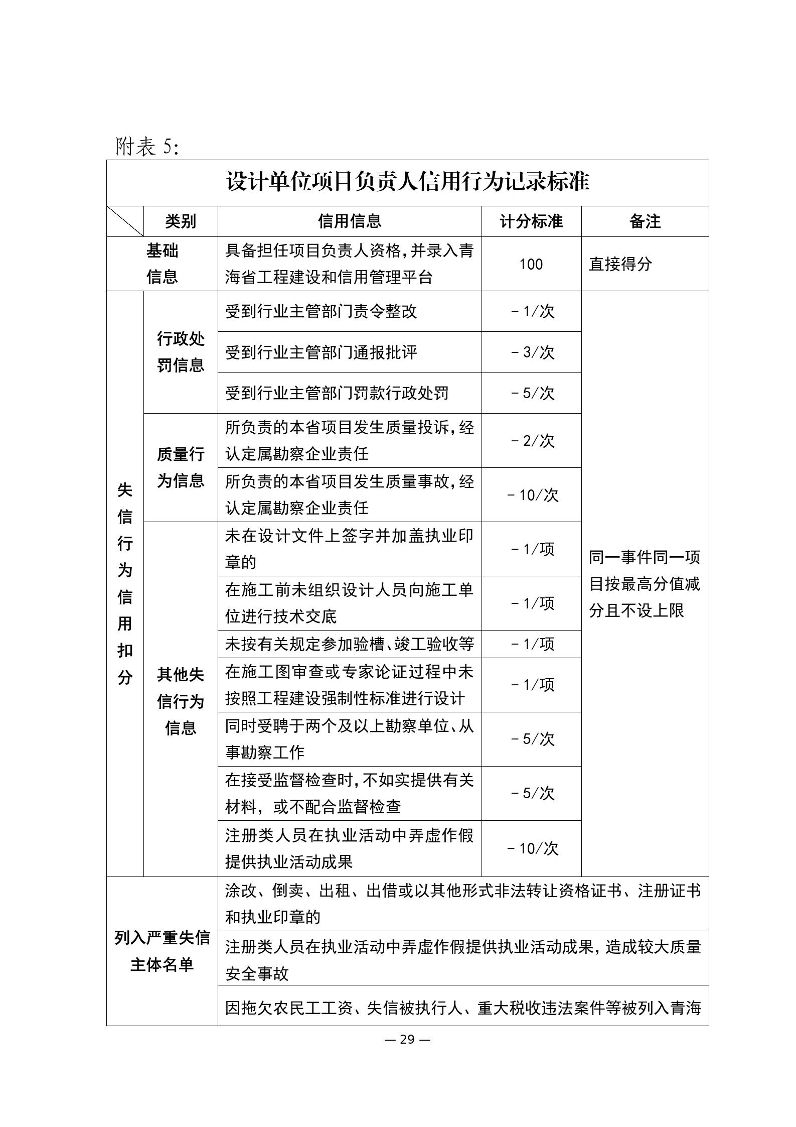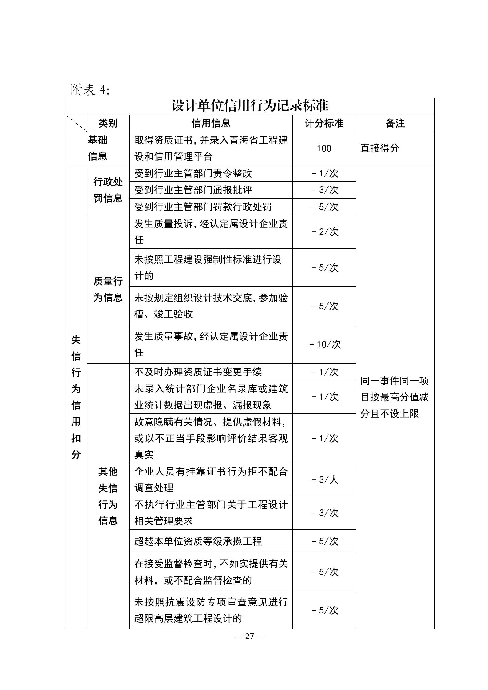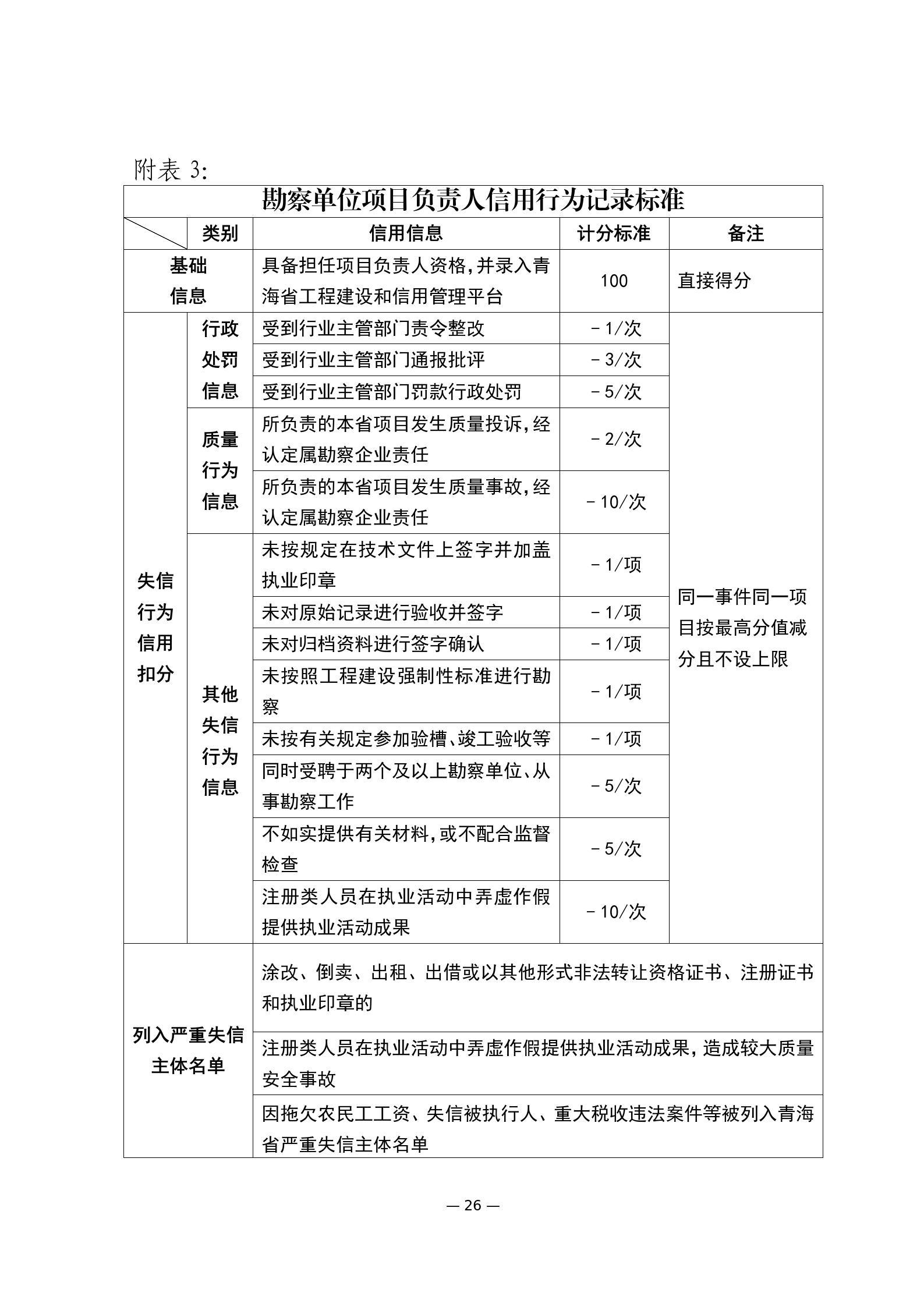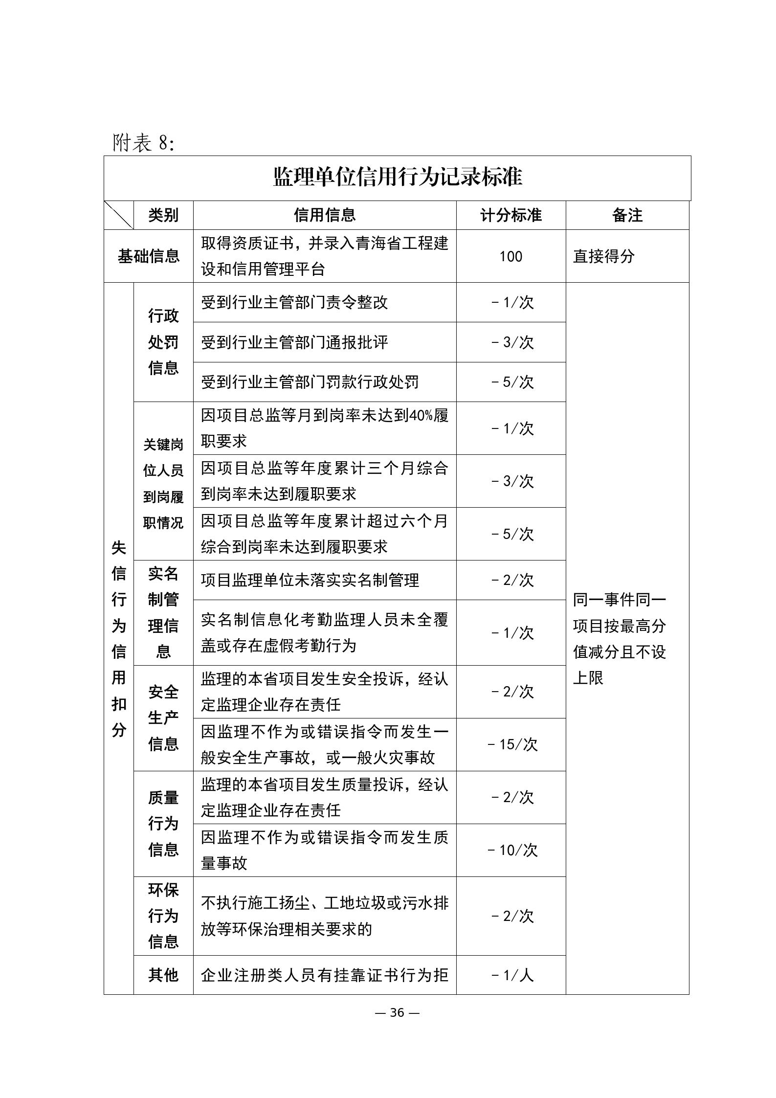 第十六條 建筑市場各方主體和從業(yè)人員的信用評價實行信用記錄、守信獎勵和失信行為動態(tài)記錄記分制。根據(jù)《青海省建筑市場各方主體和從業(yè)人員失信行為記分標(biāo)準(zhǔn)》(附件)進(jìn)行公開展示和記分?;A(chǔ)分100分。