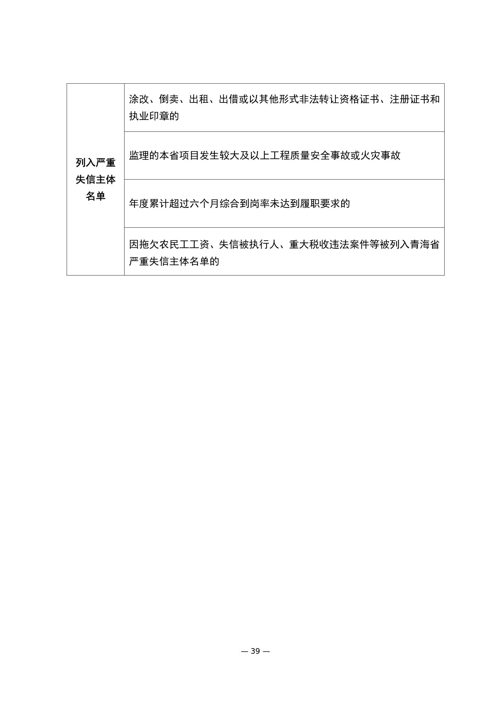 (一)在非國有投資項目中,建設(shè)單位不應(yīng)選用建筑市場主體嚴(yán)重失信主體名單的企業(yè)和從業(yè)人員參與工程建設(shè)活動;24個月內(nèi)取消其參與政府投資項目工程建設(shè)活動資格;省外進(jìn)青企業(yè)24個月內(nèi)不受理進(jìn)青登記業(yè)務(wù);