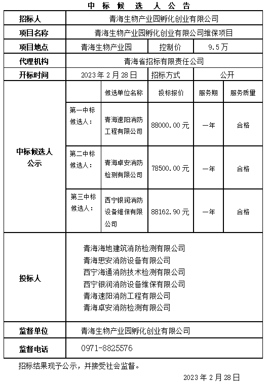 青海生物產(chǎn)業(yè)園孵化創(chuàng)業(yè)有限公司維保項目中標候選人公示