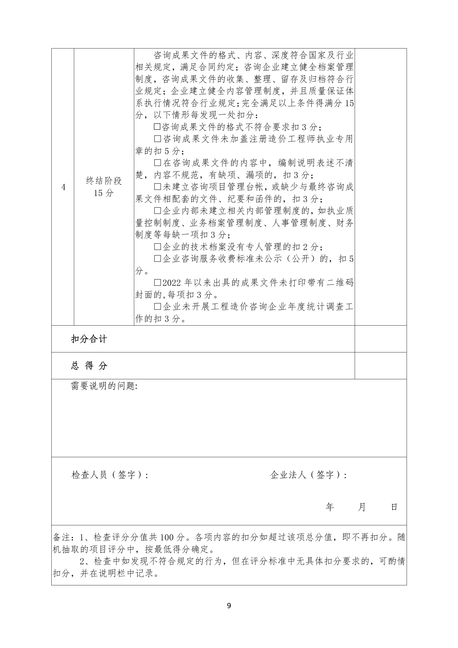 (三)不合格:工程造價(jià)咨詢企業(yè)發(fā)生過(guò)相關(guān)禁止的違法、違規(guī)行為;存在逾期未整改、整改后仍不合格,或咨詢成果文件專項(xiàng)檢查分值在60分以下的。